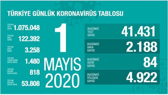 Sağlık Bakanı Fahrettin Koca, Türkiye’de son 24 saatte koronavirüs (Kovid-19) salgınına ilişkin veri tablosunu sosyal medya hesabı üzerinden paylaştı. Bakan Koca’nın paylaştığı tabloya göre, son 24 saatte 84 kişi daha yaşamını yitirdi ve bugünkü vaka sayısı ise 2 bin 188 olarak açıklandı.