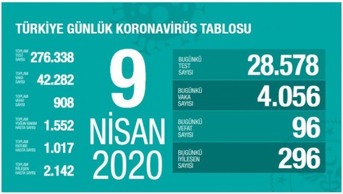 Toplam test sayısının 276 bin 338, toplam vaka sayısının da  42 bin 282 olduğunu açıklayan Koca, bugün virüs nedeniyle son 24 saatte vefat eden kişi sayısının 96 olduğunu açıkladı.