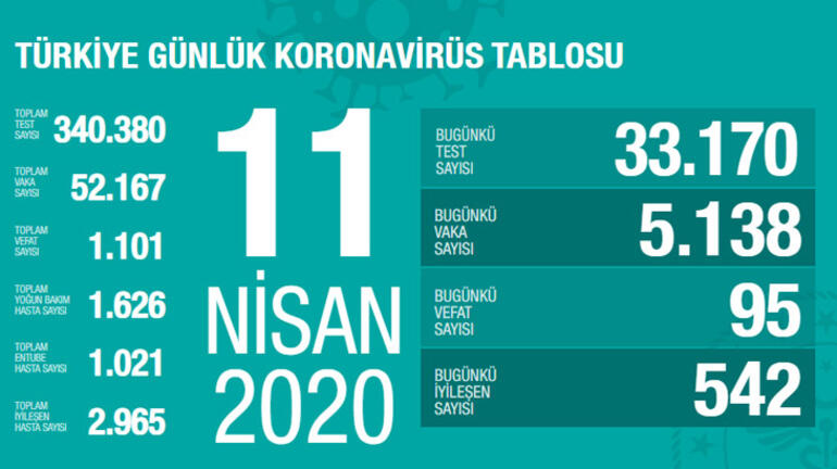 Bakan Koca’nın sosyal medya hesabından yaptığı paylaşıma göre, Türkiye’de virüs nedeniyle hayatını kaybedenlerin sayısı bin 101’e yükseldi. Ülkedeki toplam vaka sayısı ise, 52 bin 167’ye ulaştı.