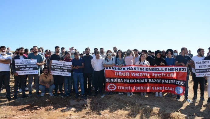 Devrimci İşçi Sendikaları Konfederasyonu’na (DİSK) bağlı Tekstil İşçileri Sendikası, Urfa’da bulunan Uğur Tekstil’de 10 Eylül tarihinde sendikal yetki aldı. Yaklaşık 300 işçinin çalıştığı fabrikada aradan geçen 24 günde fabrika yönetimi sendikayı tanımadı ve dün KOD-18 gerekçesiyle bütün işçilerin işine son verildi. DİSK Tekstil İş Bölge Temsilciliği ve işten çıkarılan onlarca işçi Urfa 2’nci Organize Sanayi Bölgesi’nde bulunan Uğur Tekstil Fabrikası önünde açıklama yaptı. Açıklamada “Sendika haktır engellenemez. Yaşasın iş emek özgürlük mücadelesi” pankartı açıldı.