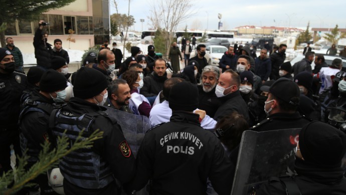 Van-Hakkari Tabip Odası ile Sağlık ve Sosyal Hizmet Emekçileri Sendikası (SES) Van Şubesi, özlük haklarının iyileştirilmesi amacıyla yapacakları greve ilişkin Van Bölge Eğitim ve Araştırma Hastanesi’nde yapmak istediği açıklamaya polis saldırdı.