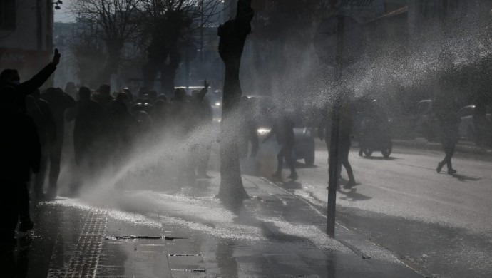 Sloganlar eşliğinde yürüyen kitleye, polis, Beşyol’da gaz bombası ve tazyikli suyla saldırdı. Sloganlarla karşılık veren kitle bir süre sonra parti binası önüne geçti.