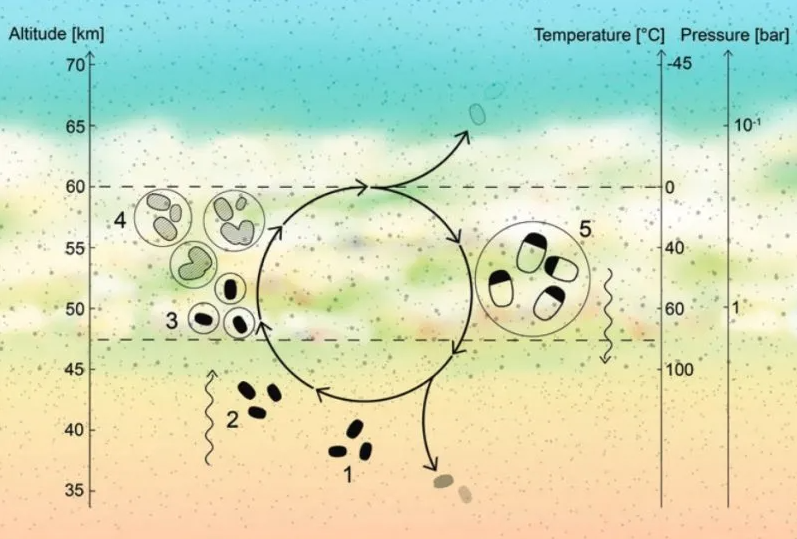 Venüs atmosferindeki organizmalar için olası bir yaşam döngüsü. (1) Dehidre olmuş mikroplar, Venüs atmosferinin alt tabakalarında vejetatif bir durumda yaşıyor olabilir. (2) Bunların sporları, yükselen akımlarla daha yaşanabilir bulut katmanlarına taşınabilir. (3) Sıvıyla enkapsüle olan sporlar, metabolik olarak aktif hale geçebilir. (4) Bu mikroplar bölünürler ve damlacıklar, koagülasyon yoluyla büyürler. (5) Damlacıklar yeterince büyüyünce, atmosfer içinde batmaya başlarlar ve aşağılara indikçe artan sıcaklıklar dolayısıyla buharlaşırlar. Bu durum, mikropları sporlara dönüşmeye zorlar ve bunlar, en baştaki gibi alt katmanlarda vejetatif halde bekler. Kaynak: Astrobiology