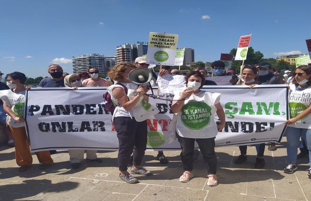 “Pandemide biz yaşam onlar rant peşinde” yazılı pankartlar ve Kanal İstanbul Projesini protesto eden dövizlerin açıldığı eylemde Fatoş Karaosmanoğlu basın metnini okudu, şöyle dedi:
