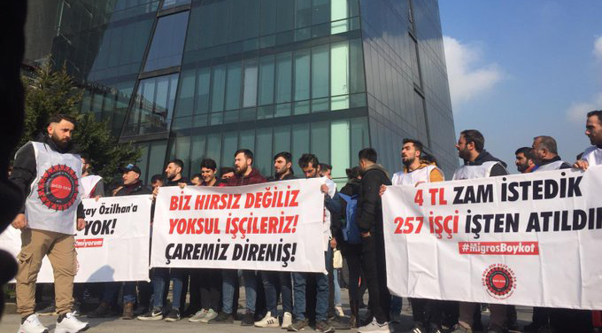 Destek amaçlı yapılan açıklamada şu ifadelere yer verildi: “Ekmek parası için, insanca yaşayabilmek için, verilen sefalet zamlarına itiraz eden Migros Esenyurt depo işçilerine, patron depoya polis sokarak ve 300 işçiyi işten atarak yanıt verdi. Migros depo işçileri, ülkenin dört bir yanındaki emekçiler gibi dayatılmak istenen köleliğe, sefalet zamlarına, sömürüye ve eşitsizliğe karşı direnişlerini sürdürüyor. Büyük çoğunluğunun temel ihtiyaçlarını karşılayamaz durumda yaşadığı bir ülkede ne toplum olmaktan, ne insan kalmaktan, ne demokratik hak ve özgürlüklerden söz edilebilir. Bizler Migros depo işçilerinin haklı direnişini destekliyor, Migros kadın emekçilerinden gelen ‘Migros marketlerini boykot’ çağrısına sesimizi katıyoruz.”