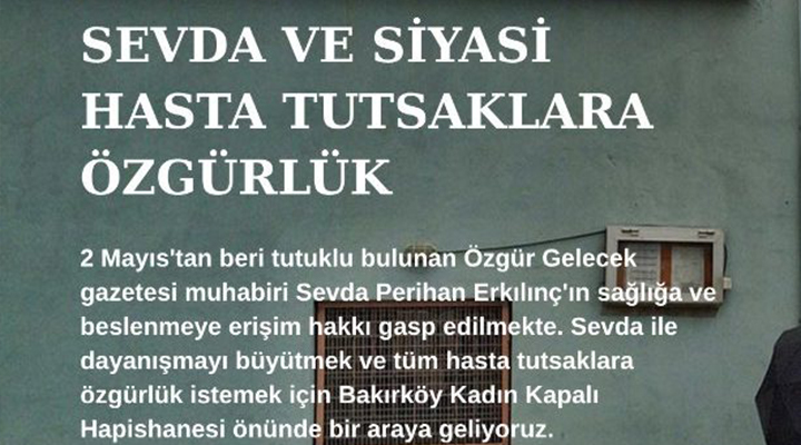 “2 Mayıs’tan beri tutuklu bulunan Özgür Gelecek gazetesi muhabiri Sevda Perihan Erkılınç’ın sağlığa ve beslenmeye erişim hakkı gasp edilmekte. Sevda ile dayanışmayı büyütmek ve tüm hasta tutsaklara özgürlük istemek için Bakırköy Kadın Kapalı Hapishanesi önünde bir araya geliyoruz.”