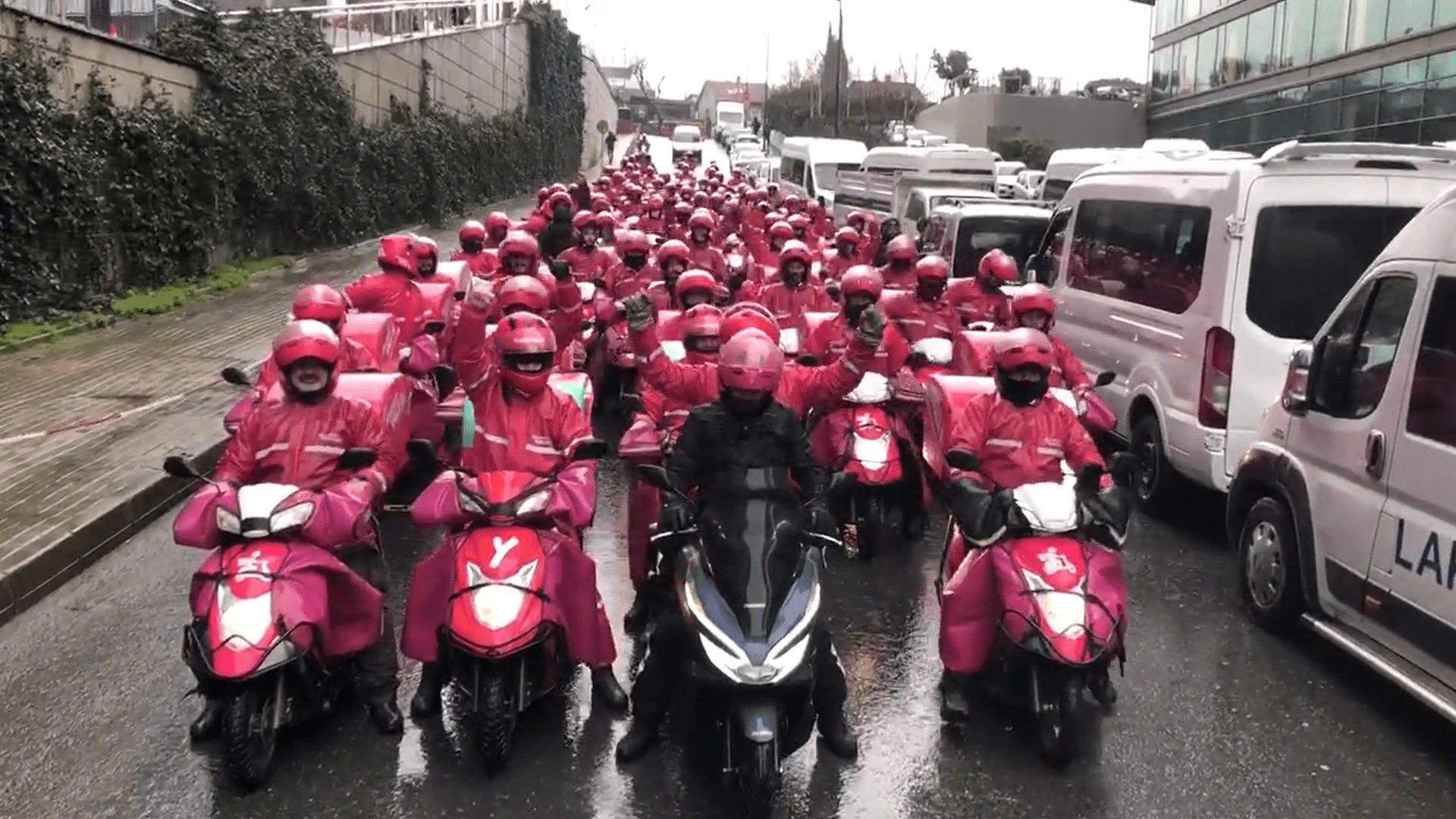 İşçiler bugün de eylemde. İstanbul’un ilçelerinden bir araya gelerek yola çıkan Yemeksepeti Banabi kuryeleri şirkete taleplerini bir kez daha iletmek üzere Levent’teki Genel Müdürlük binası önüne gidiyor.