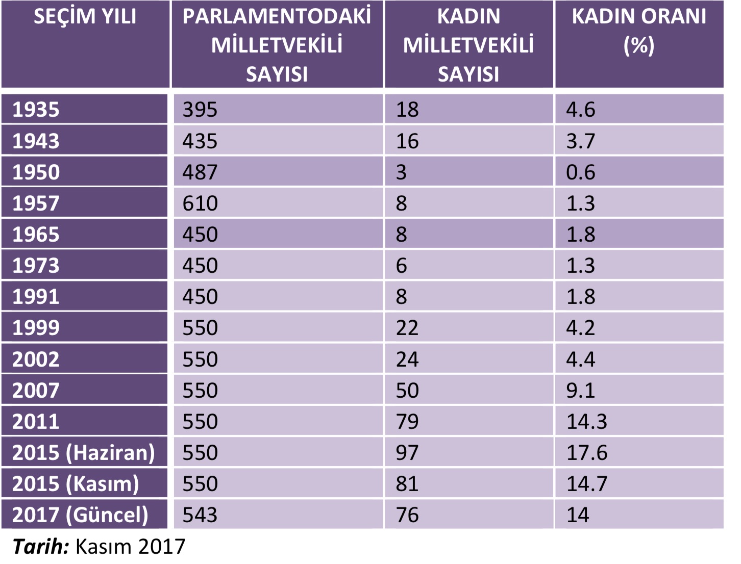 Yüzde 17,3 1935 seçimlerinden bu yana en yüksek oran olmakla birlikte Türkiye, kadınların siyasete katılımı, parlamentoda temsili konusunda dünya sıralamalarında geride yer alıyor. Emekçi kadınların, bir bütün olarak da emekçilerinse hiç temsil edilmediği görülüyor.