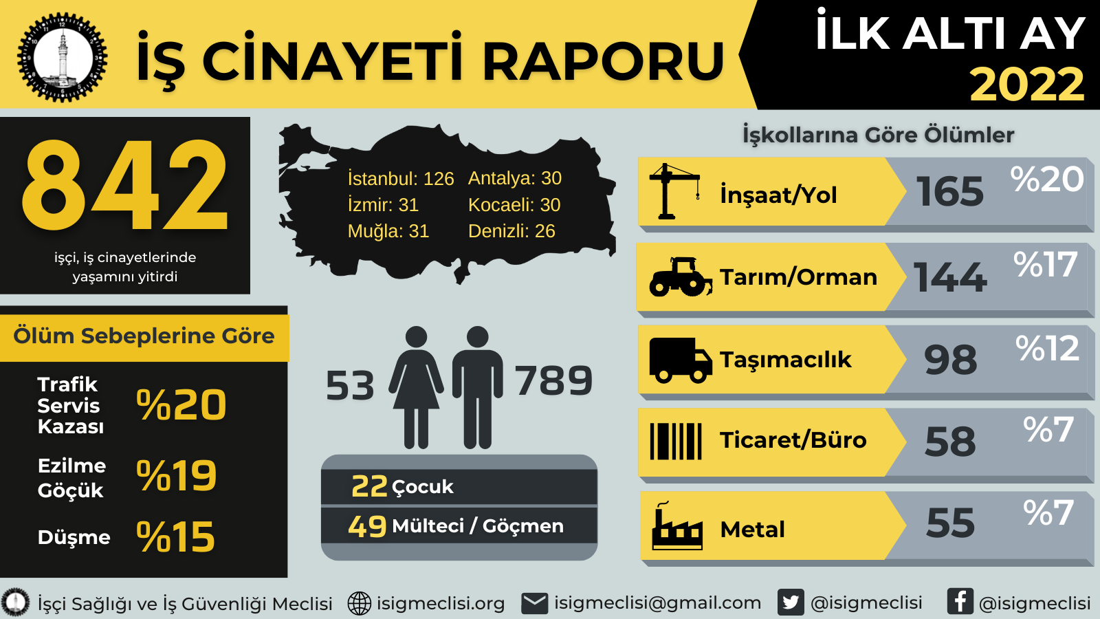 İşçi Sağlığı ve İş Güvenliği Meclisi (İSİG Meclisi) iş cinayetleriyle ilgili 2022 yılının ilk altı ayına ilişkin bir rapor yayımladı. Buna göre 2022 yılının ilk altı ayında en az 842 işçi yaşamını yitirdi.