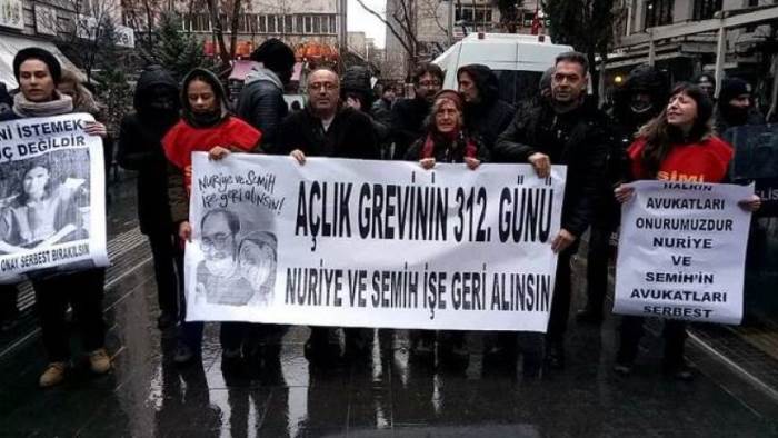 Ankara Yüksel Caddesi’nde devam eden “İşimizi geri istiyoruz” eylemi 432’nci gününe girdi. KHK ile ihraç edilen kamu emekçileri İnsan Hakları Anıtı önünde basın açıklaması yapmak istedi. Alev Şahin, “İnsanlar açlıktan ve yoksulluktan kendini yakıyorlar. Duymuyorsunuz. Nuriye ve Semih 312 gündür aç duymuyorsunuz” dediği sırada polis saldırdı.