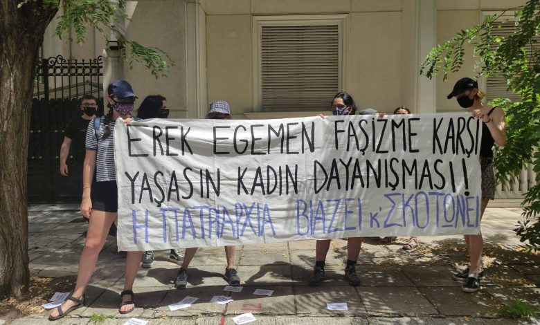 İstanbul Sözleşmesi’nden Türk devletinin ayrılmasına karşı bugün Atina’da kadınlar Türk Konsolosluğu önünde eylem yaptı