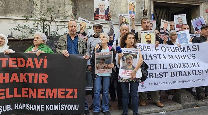 İnsan Hakları Derneği (İHD) İstanbul Şubesi Hapishaneler Komisyonu, hasta tutsakların durumuna dikkat çekmek amacıyla her hafta düzenlenen “F Oturumu” eyleminin 605’incisini dernek binası önünde gerçekleştirdi. Bu haftaki eylemde Van F Tipi Kapalı Hapishanesi’nde tutulan ağır hasta tutsak Delil Bozkurt’un sağlık durumuna dikkat çekildi. Bu haftaki açıklamayı İHD Hapishaneler Komisyonu üyesi Hatice Onaran okudu.